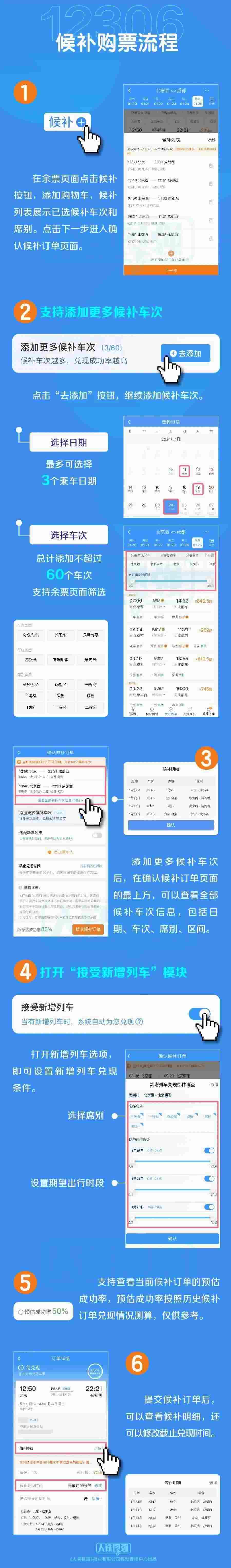 為提升旅客購票體驗,鐵路部門加大研發(fā)力度,對鐵路12306候補購票功能進行了優(yōu)化升級。一是增加候補訂單數(shù)量。每名旅客可提交的待兌現(xiàn)候補訂單數(shù)量由2個增至6個,每個訂單最多可添加9名乘車人。二是增加備選方案數(shù)量。原來旅客提交候補訂單時,可選擇相鄰2個乘車日期、每個日期可選擇5個“車次+席別”的組合,最多可選擇10個組合。優(yōu)化升級后,旅客可選擇預售期內任意3個乘車日期,累計最多可選擇60個“日期+車次”的組合,每個車次可選多個席別。三是擴大候補訂單兌現(xiàn)時間選擇范圍。原來候補訂單截止兌現(xiàn)時間最晚為開車前2小時,優(yōu)化升級后調整為開車前20分鐘,旅客可在更大范圍內根據實際情況自主選擇修改截止兌現(xiàn)時間。四是臨時新增旅客列車席位優(yōu)先配售給已提交候補訂單的旅客。旅客在提交候補訂單時,可選擇接受購買符合出行需求的新增旅客列車車票,如鐵路部門臨時新增旅客列車,在車票起售時,鐵路12306將自動優(yōu)先配售給已提交候補訂單的旅客,旅客無需人工查詢增開列車信息再購票。