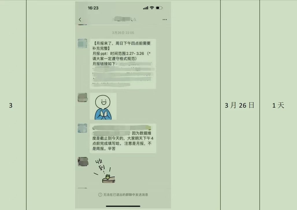 張?bào)以谝凰伤鶎?shí)習(xí),一次工作任務(wù)中,她常在夜晚23點(diǎn)、凌晨1點(diǎn)或5點(diǎn)收到溝通對象的消息。那項(xiàng)工作是要處理未成年人退款,有一個(gè)家長不怎么管孩子,事情需要等孩子放學(xué)后處理,張?bào)医o這位家長發(fā)消息時(shí)常收不到回復(fù)。