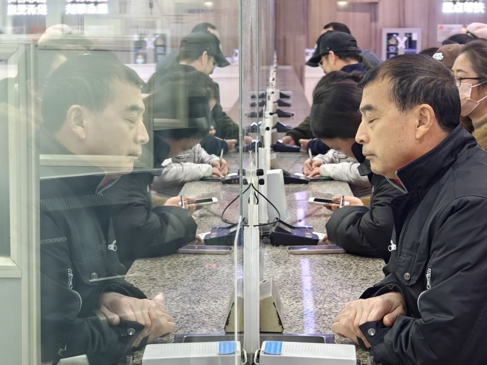 呂興明(左二)正在售票窗口購(gòu)票。新華社記者 謝佼 攝
