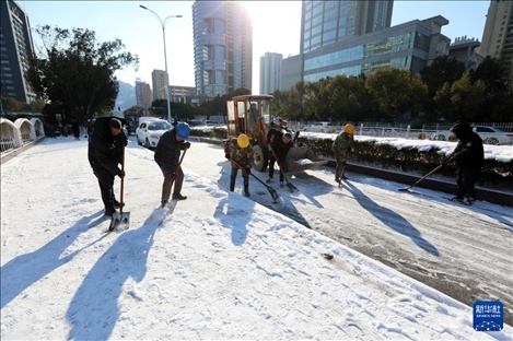 1月23日,在浙江省溫嶺市,人們?cè)谇宄访姹=?,受寒潮天氣影響,我?guó)多地迎來(lái)降溫降雪天氣,各地積極組織相關(guān)部門開(kāi)展抗凝除雪工作,保安全保暢通。新華社發(fā)(周學(xué)軍攝)