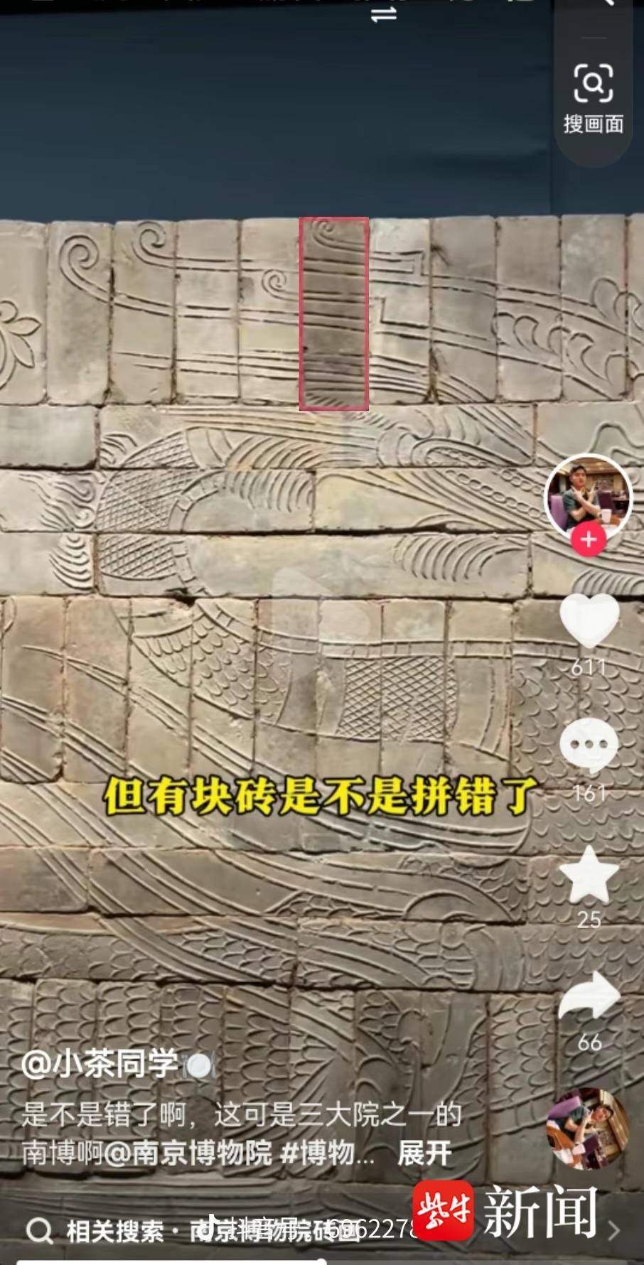 “家人們,我好像在南博發(fā)現(xiàn)了一件展品有一處錯(cuò)誤”,網(wǎng)友“小茶同學(xué)”發(fā)視頻表示,“1月25日去南京博物院游覽,在看到《羽人戲龍磚畫》時(shí),發(fā)現(xiàn)磚畫很精美,保留很完整。磚畫上的陽刻線條尤其讓我感到震撼,看到深色磚的部分,我感覺有點(diǎn)別扭,當(dāng)時(shí)就臆想著那塊磚反過來是不是更好一點(diǎn),于是發(fā)了一個(gè)視頻求助?!?/p>