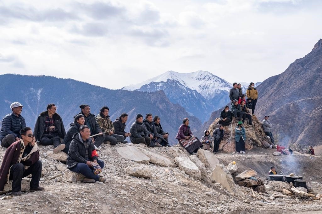 村民們席地而坐觀看比賽(1月21日攝)