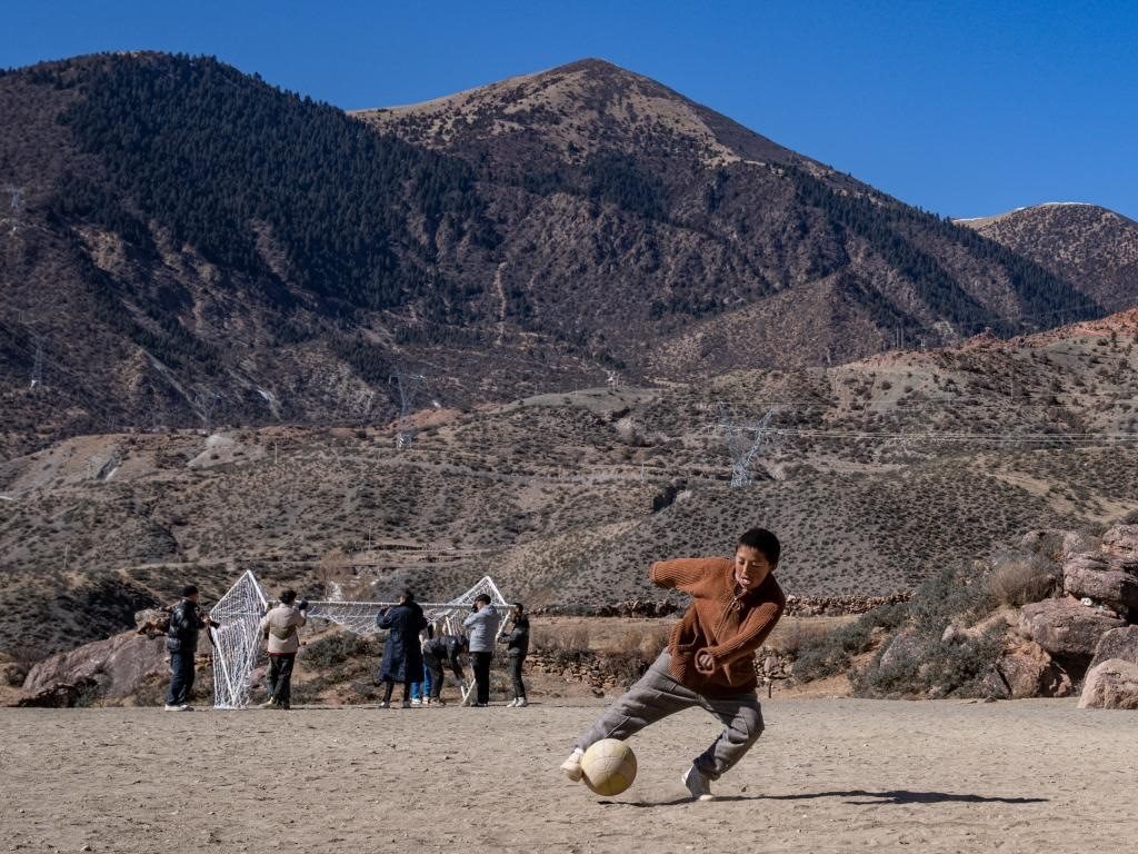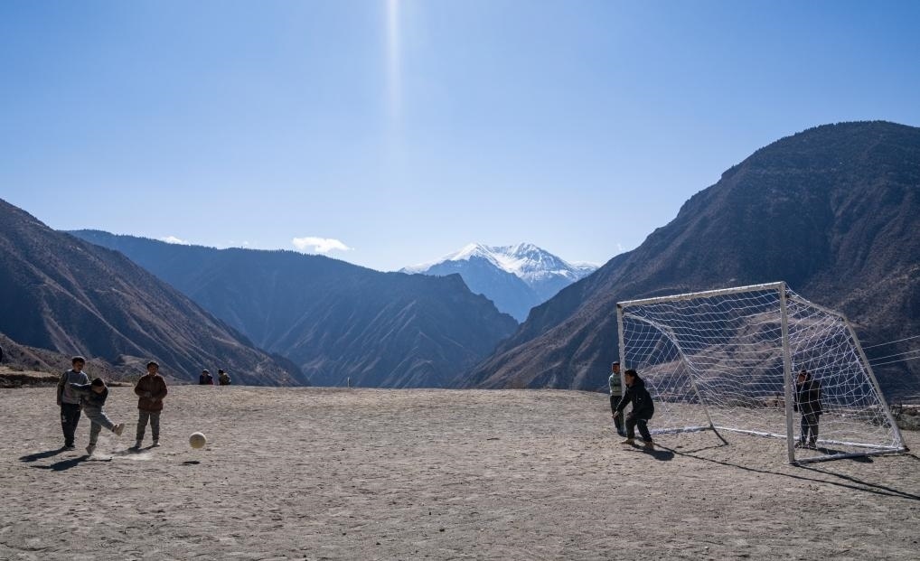 等待焊接的一會(huì)兒工夫,村里的孩子們也要跑來和嘎瑪群美踢兩腳