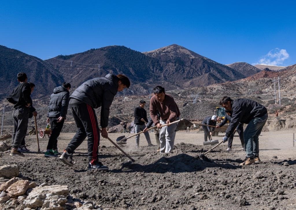 嘎瑪群美(中)和球員們正在平整球場(chǎng)(1月20日攝)
