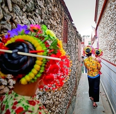“今生戴花,來(lái)世漂亮”。在我國(guó)福建省泉州市的蟳埔村里,總能聽(tīng)到這樣的話語(yǔ)。這座漁村,無(wú)論是巷子里拍照的姑娘,還是街邊滿頭銀發(fā)撬海蠣的阿婆,都盤(pán)發(fā)梳成圓髻,系上紅頭繩,插著滿頭花,成為村里靚麗的“風(fēng)景線”。五彩斑斕的簪花、象牙固定的發(fā)髻、蚵殼筑成的房屋……獨(dú)具特色的文化印記讓這座漁村迅速“出圈”,成為知名網(wǎng)紅地。