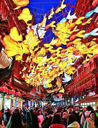 在上海豫園商城拍攝的“一夜魚龍舞”主題燈組與觀燈人潮。新華社發(fā)