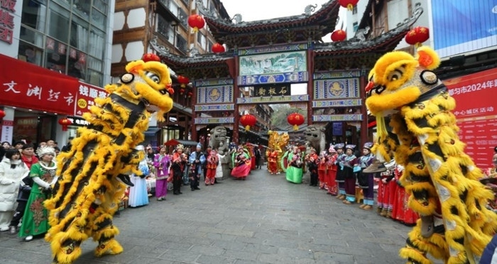 各地舉辦豐富多彩的民俗展演活動(dòng)慶新春,人們?cè)谫F州省黔南布依族苗族自治州都勻市石板街觀看舞獅表演。