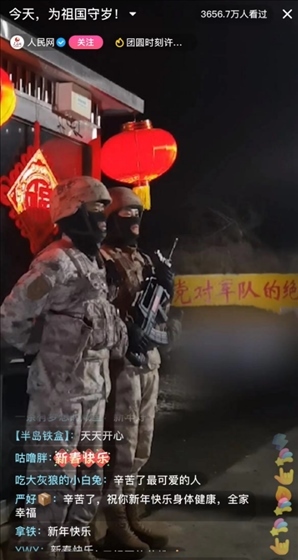 除夕當天中午起,人民網(wǎng)24小時特別節(jié)目《我為祖國守歲》將鏡頭對準國家移民管理總局、西藏軍區(qū)邊防某部、77680部隊、武警安徽總隊池州支隊、甘肅省森林消防總隊、中國鐵路北京局等祖國各地30多個頗具典型性的基層一線單位,采用紀實手法講述公安、消防、邊防、醫(yī)生、鐵路乘務(wù)員、醫(yī)護人員等忠于使命、甘于奉獻、恪盡職守的“年味”故事。