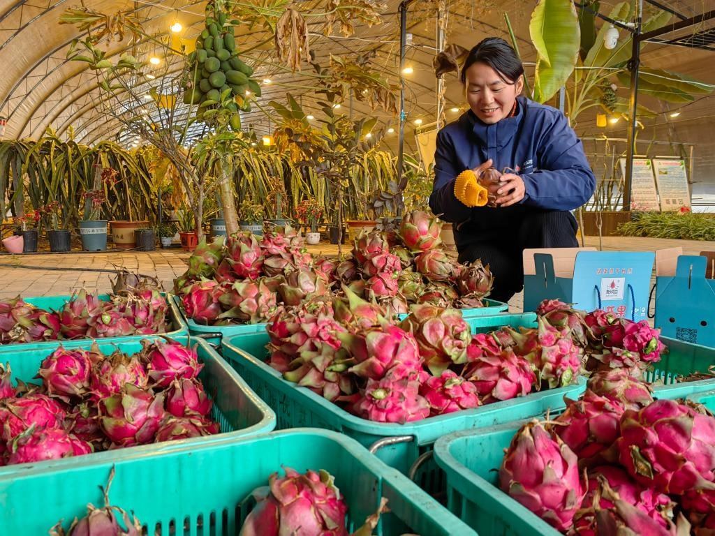 郭娟茹正在查看即將打包、裝箱、發(fā)運的新鮮火龍果。 新華社記者孫正好 攝