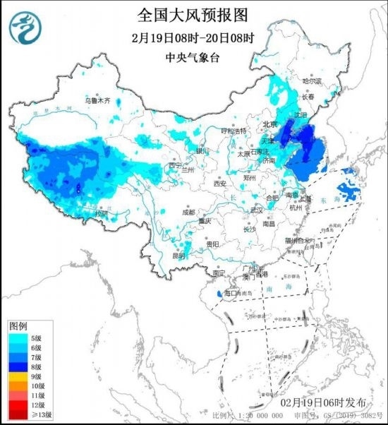 中央氣象臺(tái)2月19日6時(shí)繼續(xù)發(fā)布大風(fēng)藍(lán)色預(yù)警:預(yù)計(jì),2月19日8時(shí)至20日8時(shí),西藏中西部、青海中南部、內(nèi)蒙古東南部、遼寧西部和南部、華北東部、黃淮東部、江淮東部等地的部分地區(qū)有5~6級(jí)風(fēng),陣風(fēng)7~9級(jí)。渤海、渤海海峽、黃海大部海域?qū)⒂?~8級(jí)風(fēng),陣風(fēng)9~10級(jí)。