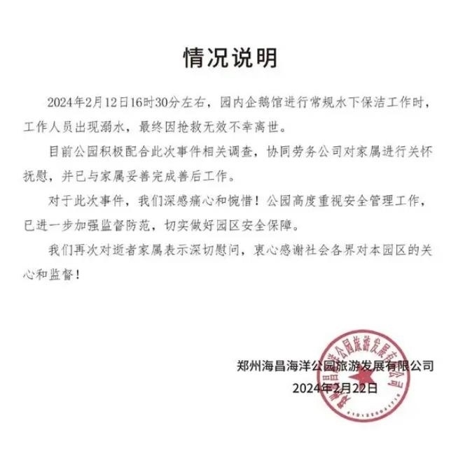 ·鄭州一海洋館潛水員在館內(nèi)溺亡,涉事公司發(fā)布情況說(shuō)明:將積極配合事件調(diào)查,進(jìn)一步加強(qiáng)安全監(jiān)督。