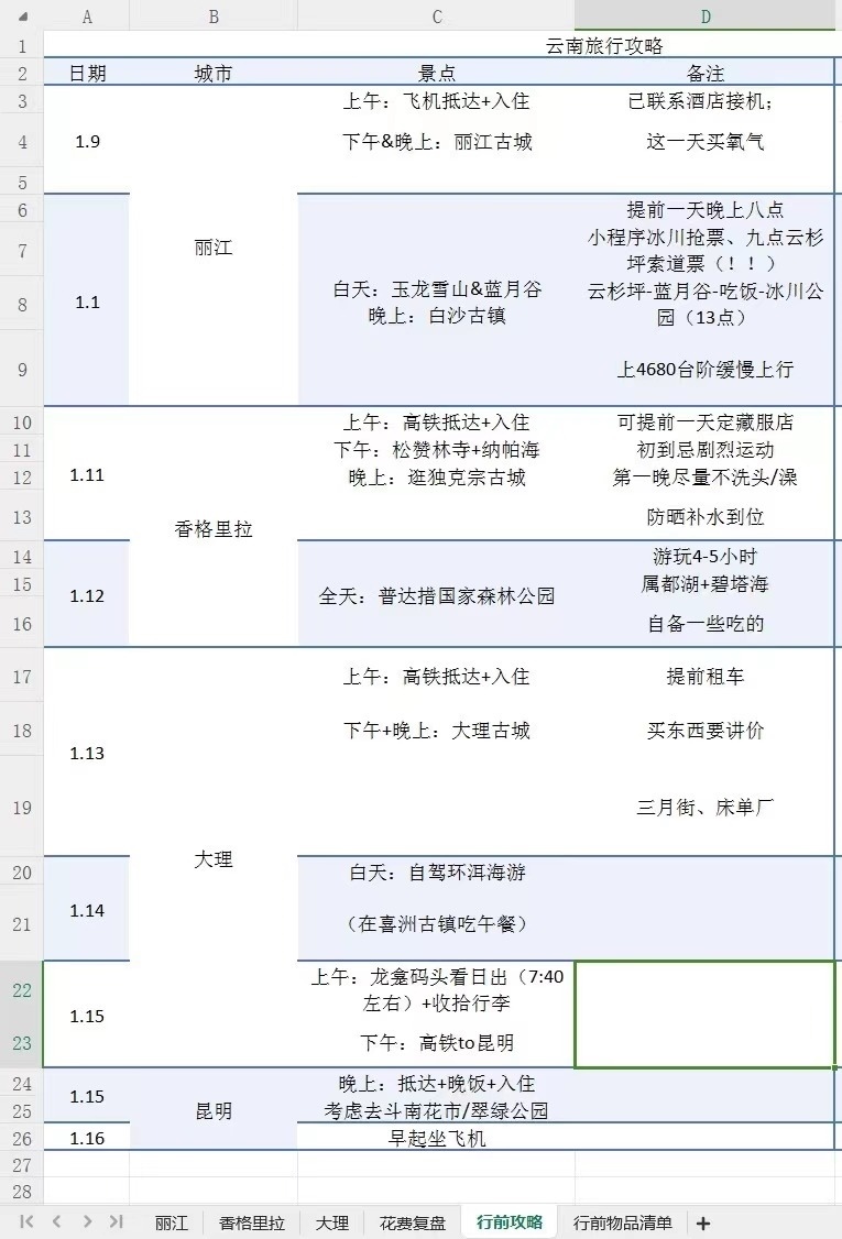 這個(gè)冬天去云南旅行前,周玫將自己的計(jì)劃制成一張excel表格,具體到每個(gè)市、每個(gè)景點(diǎn)、每種美食……旅行結(jié)束后,她還對云南游的具體執(zhí)行情況進(jìn)行了復(fù)盤總結(jié),在社交平臺上分享給她的“電子驢友”。