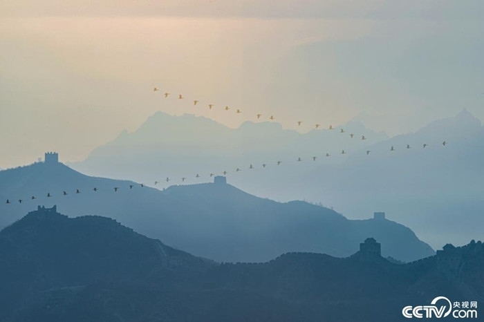 3月7日,河北承德,遷徙的候鳥飛過金山嶺長(zhǎng)城上空。