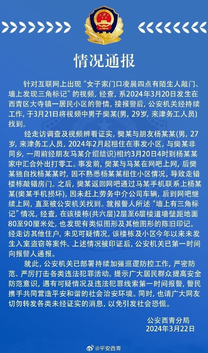 經(jīng)走訪調(diào)查及視頻辨看證實,樊某與朋友楊某某(男,27歲,來津務(wù)工人員,2024年2月起租住在事發(fā)小區(qū),與樊某非同鄉(xiāng),一周前經(jīng)朋友馬某介紹結(jié)識)相約3月20日4時到楊某某家中匯合外出打零工。事發(fā)前,樊某與馬某在網(wǎng)吧上網(wǎng),后樊某獨自找楊某某時,因不熟悉楊某某租住小區(qū)情況,導(dǎo)致走錯樓棟敲錯房門。之后,樊某返回網(wǎng)吧通過馬某手機聯(lián)系上楊某某(樊某手機損壞),因未趕上勞務(wù)中介公司車輛,后到網(wǎng)吧繼續(xù)上網(wǎng),直至被公安機關(guān)找到。就報警人所述“墻上有三角標(biāo)記”情況,經(jīng)查,在該樓棟(共六層)2層至6層樓道墻壁距地面80至90厘米處,也發(fā)現(xiàn)有類似圖形及其他圖形的陳舊印記經(jīng)走訪其他住戶,未見可疑情況,該樓棟及小區(qū)今年以來未發(fā)生入室盜竊等案件。上述情況被印證后,公安機關(guān)已第一時間向報警人通報。