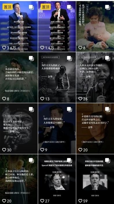 “滿屏皆是馬斯克”之外,在一些雞湯類賬號(hào)里,作家余華、知名投資人沃倫·巴菲特等也是“高產(chǎn)”創(chuàng)作者。