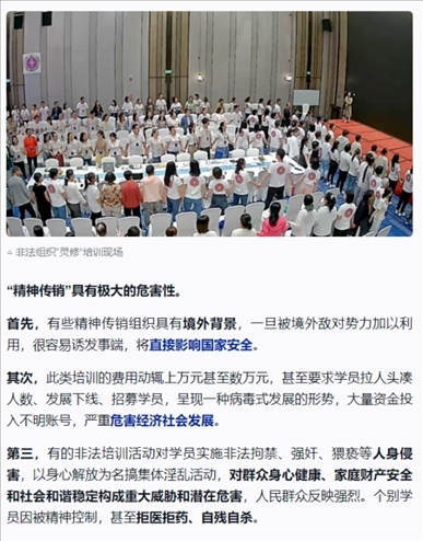 ·起底被公安機(jī)關(guān)打擊查處的“靈修”組織:打著“靈修”“靈魂塑造”等旗號,對學(xué)員實(shí)施精神控制;借“靈修”提升之名,行“精神傳銷”之實(shí)。鄧海鵬及其創(chuàng)辦的培訓(xùn)機(jī)構(gòu),打著“靈魂塑造”“集體場域”的幌子,對學(xué)員進(jìn)行精神控制,然后以傳銷、加盟、進(jìn)階等現(xiàn)代營銷模式達(dá)到斂財漁色目的。人前他要求學(xué)員全部吃素,自己每天大魚大肉,必吃海參;人前他要求學(xué)員不能有不動產(chǎn)、錢是修行來的,自己卻拿著騙來的錢去買理財產(chǎn)品;人前他無兒無女,實(shí)則有妻有女;人前假裝不近女色,背地里卻漁色女學(xué)員。