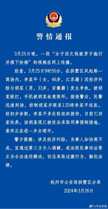 ·杭州拱墅警方通報女子被拖行推下扶梯:因經(jīng)濟(jì)糾紛起爭執(zhí),男子被依法采取刑事強(qiáng)制措施。
