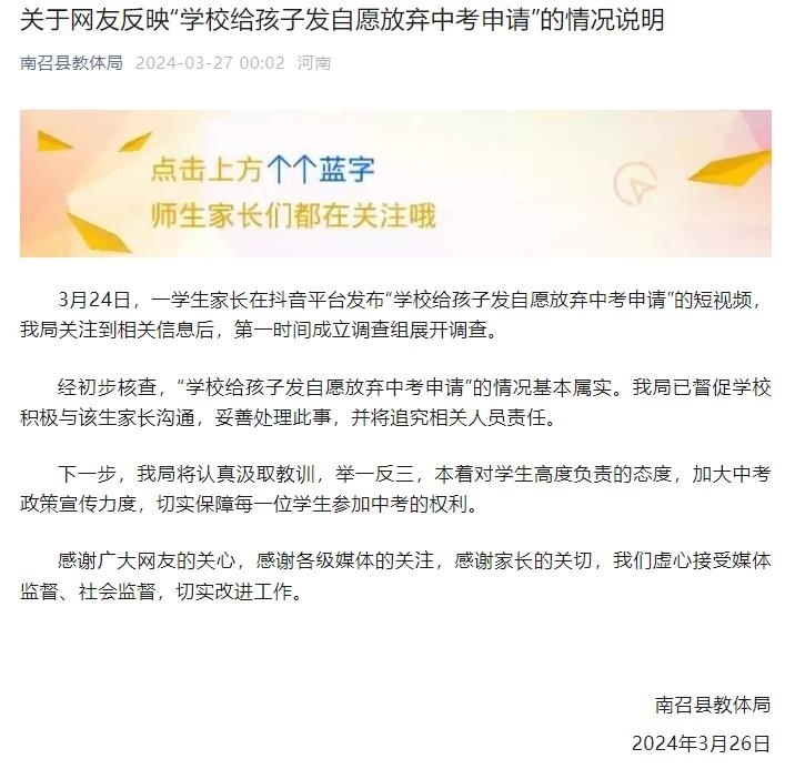 央視網(wǎng)消息:南召縣教體局3月27日發(fā)布《關于網(wǎng)友反映“學校給孩子發(fā)自愿放棄中考申請”的情況說明》。