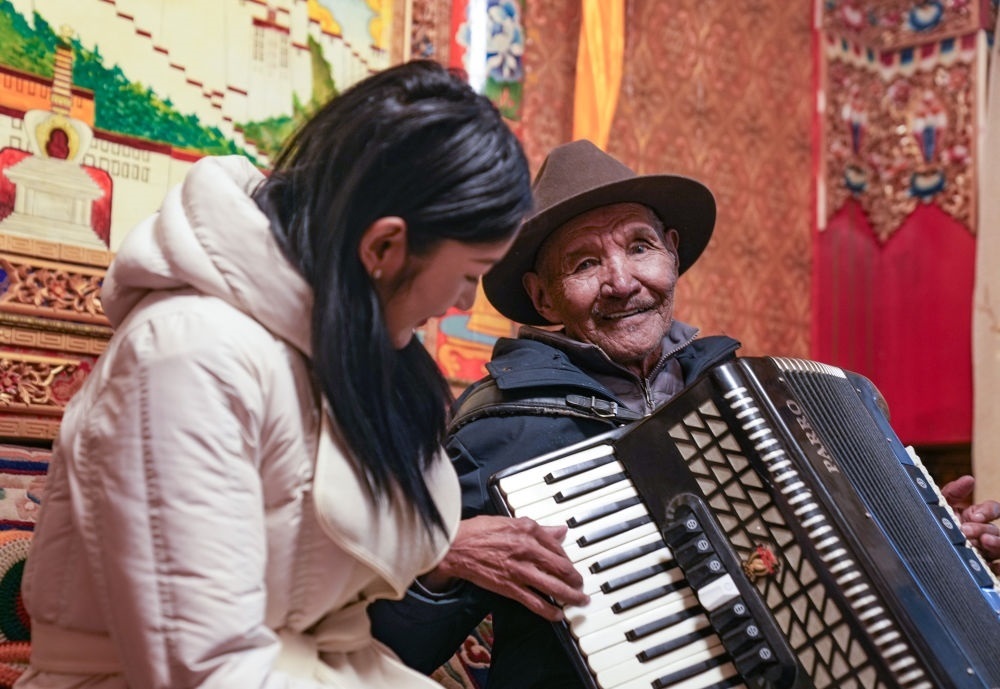 朗杰(右)指導(dǎo)孫女索朗曲珍拉手風(fēng)琴(3月13日攝)。新華社記者 晉美多吉 攝