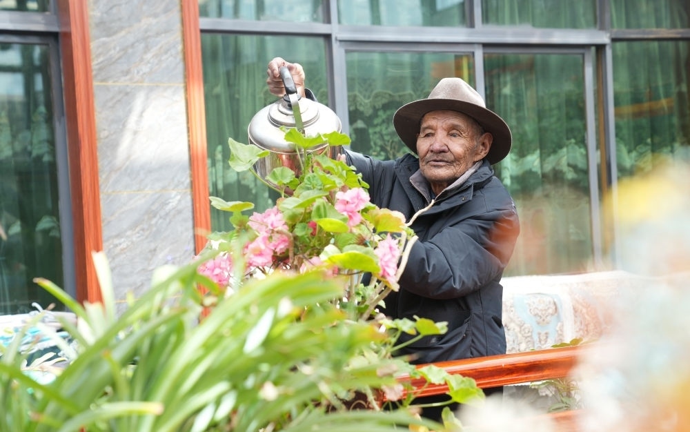 朗杰在自家二樓給花澆水(3月13日攝)。新華社記者 晉美多吉 攝