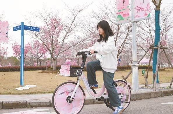 櫻花節(jié)期間,學(xué)校是禁止機(jī)動(dòng)車入校的。校園大,游人累了怎么辦?上經(jīng)貿(mào)大學(xué)生食堂門口便出現(xiàn)了一道亮麗的風(fēng)景線:那就是學(xué)校和“哈啰單車”聯(lián)名的粉色共享單車。50輛粉色的單車整齊排放在廣場(chǎng)上,車頭的粉色風(fēng)車迎風(fēng)轉(zhuǎn)動(dòng),櫻花節(jié)專屬IP“貿(mào)小櫻”人偶,揮舞著雙手邀請(qǐng)師生們前來騎行。聯(lián)名活動(dòng)設(shè)計(jì)了賞櫻打卡點(diǎn),游客可以騎著櫻花單車游覽校園,在3個(gè)最佳賞櫻點(diǎn)拍照打卡,體驗(yàn)各處櫻花的詩情畫意。