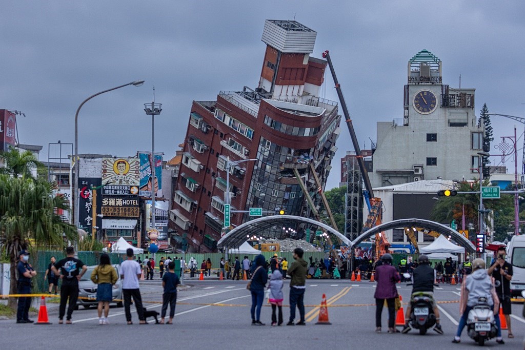 2024年4月5日,臺灣花蓮縣海域發(fā)生7.3級地震后,傾斜倒塌的建筑物正在被拆除。視覺中國 圖