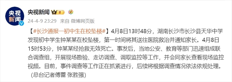 ·湖南長(zhǎng)沙縣通報(bào)初中生在校墜亡:將根據(jù)調(diào)查情況依法依規(guī)處理。
