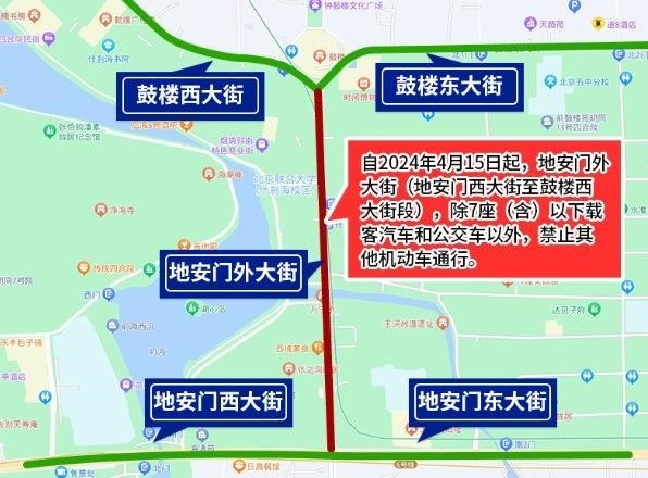 為確保全國重點文物保護單位“大運河——玉河故道(澄清上閘含萬寧橋)”的文物安全與交通安全,根據(jù)文物保護和道路交通安全有關(guān)法律法規(guī)規(guī)定,決定自2024年4月15日起,地安門外大街(地安門西大街至鼓樓西大街段),除7座(含)以下載客汽車和公交車以外,禁止其他機動車通行。
