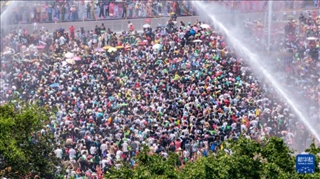 4月12日,云南省德宏傣族景頗族自治州2024年潑水狂歡節(jié)在芒市開幕,上萬名當(dāng)?shù)馗髯迦罕娕c遠道而來的游客歡聚芒市廣場,互相潑水祝福。
