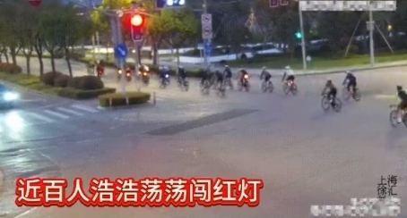 ·“暴騎團”近百人無視交規(guī)闖紅燈,上海交警開展專項整治。