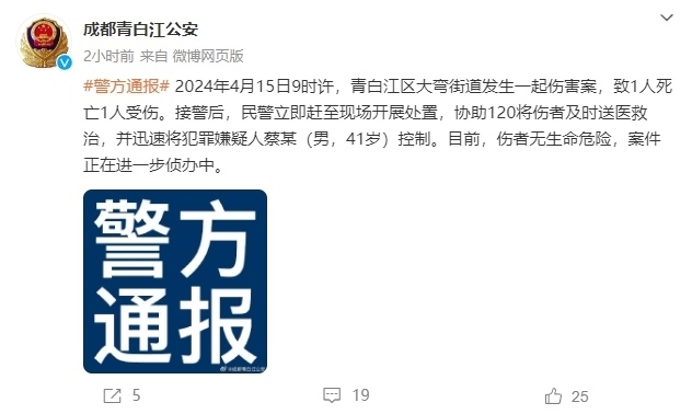 ·警方通報(bào):成都青白江發(fā)生一起傷害案致1死1傷。