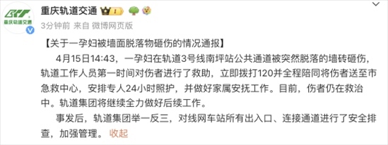 央視網(wǎng)消息:據(jù)@重慶軌道交通 微博通報,4月15日14:43,一孕婦在軌道3號線南坪站公共通道被突然脫落的墻磚砸傷,軌道工作人員第一時間對傷者進行了救助,立即撥打120并全程陪同將傷者送至市急救中心,安排專人24小時照護,并做好家屬安撫工作。目前,傷者仍在救治中。軌道集團將繼續(xù)全力做好后續(xù)工作。