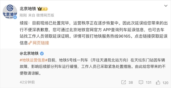 央視網(wǎng)消息:據(jù)@北京地鐵 微博消息,目前現(xiàn)場(chǎng)已處置完畢,運(yùn)營秩序正在逐步恢復(fù)中。此前,北京地鐵發(fā)文稱,地鐵5號(hào)線一列車(開往天通苑北站方向)在天壇東門站因車輛故障,影響后續(xù)部分列車運(yùn)行緩慢,工作人員已采取緊急處置措施。
