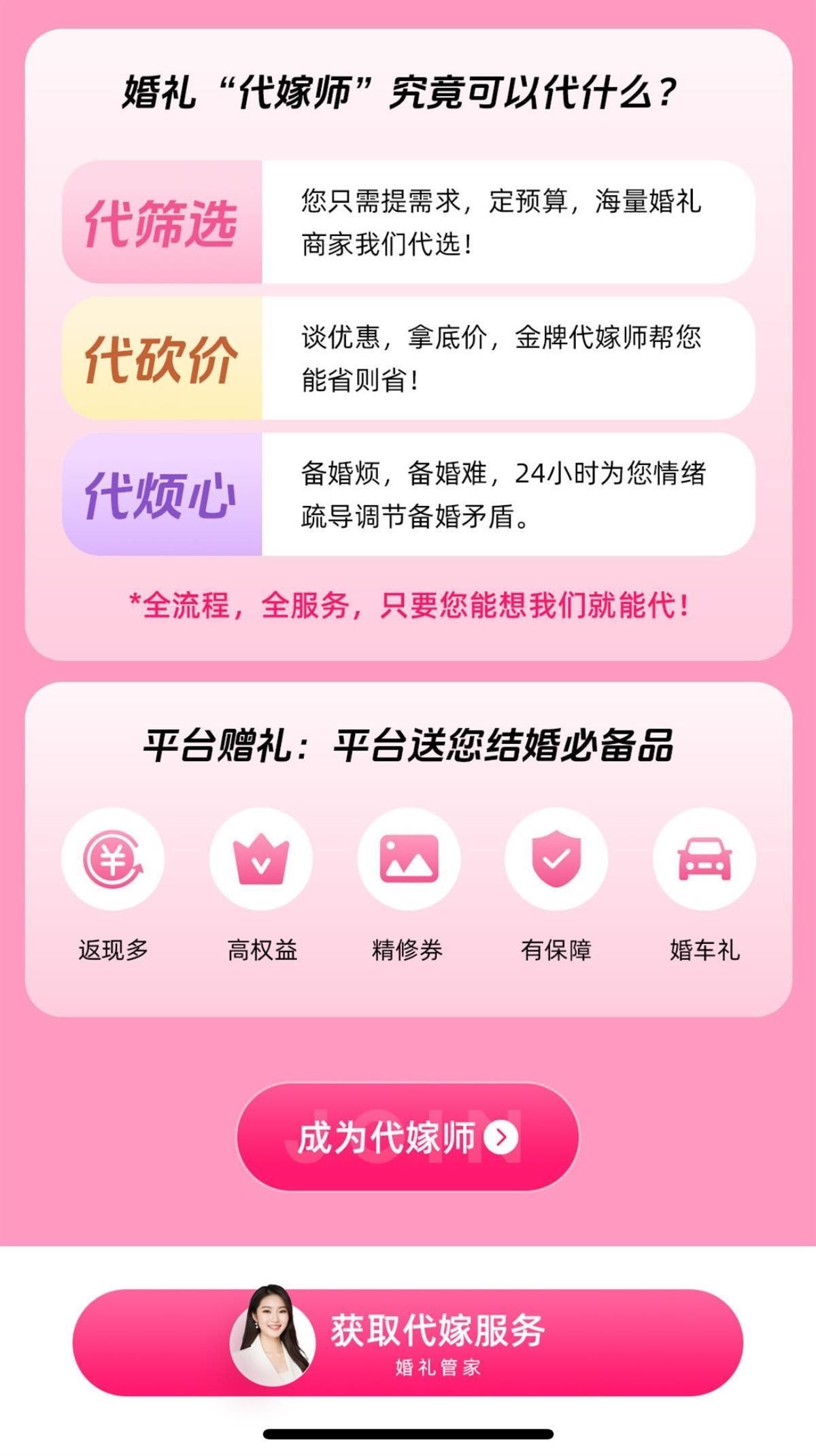 該頁面還宣傳稱,代嫁師可以“代篩選”“代砍價”“代煩心”,并且還有一行字強調(diào):“全流程,全服務(wù),只要您能想,代嫁師就能代?!?/p>