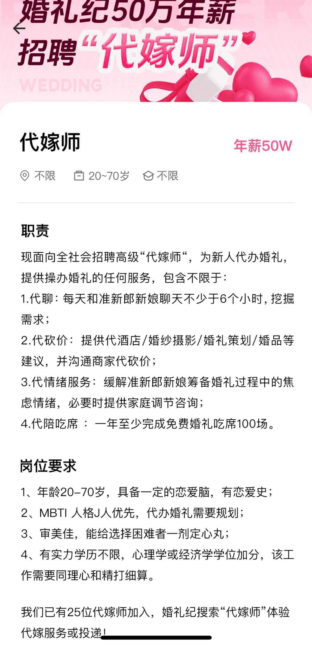 該招聘信息還顯示,目前,平臺已有25位代嫁師加入。