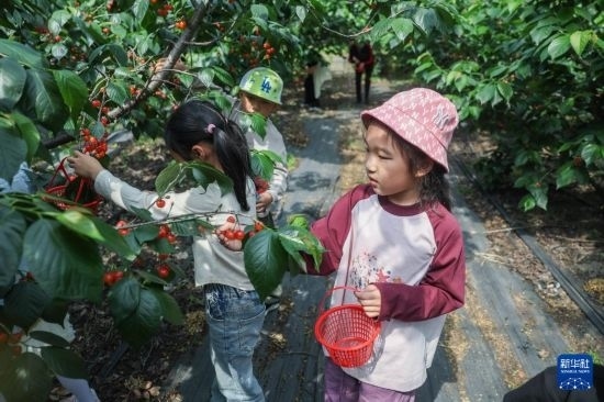4月24日,小朋友在泰山村共富工坊的櫻桃園里采摘櫻桃。