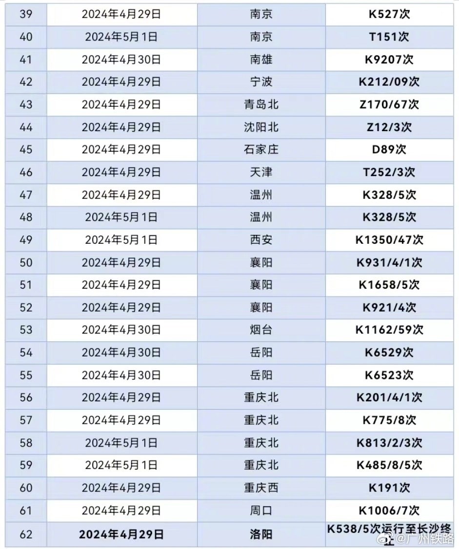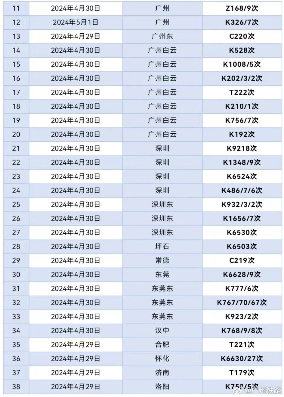 央視網(wǎng)消息:據(jù)@廣州鐵路 消息,據(jù)廣鐵集團4月29日12時通報,根據(jù)氣象部門消息,近期湖南大部、廣東中北部將出現(xiàn)較大范圍的大到暴雨,將對鐵路運輸秩序造成一定的不利影響。廣鐵集團于4月29日至5月1日期間計劃停運京廣鐵路普速列車62列,京廣、京九普鐵和京廣高鐵的部分列車將出現(xiàn)不同程度晚點。
