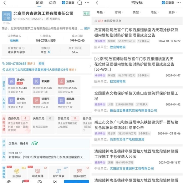 企查查信息顯示,北京同興古建筑工程有限責(zé)任公司成立于1999年,法定代表人為徐長林。招投標(biāo)信息顯示,該公司先后中標(biāo)全國多地文保單位修繕工程,其中包含故宮博物院、全國重點(diǎn)文保單位天峰山古建筑群、原齊魯大學(xué)近現(xiàn)代建筑群等。