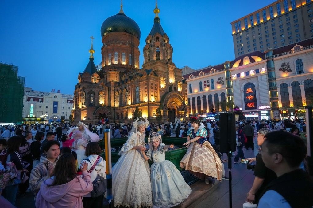 5月1日,游客在哈爾濱建筑藝術廣場盛裝拍照。新華社記者 王建威 攝