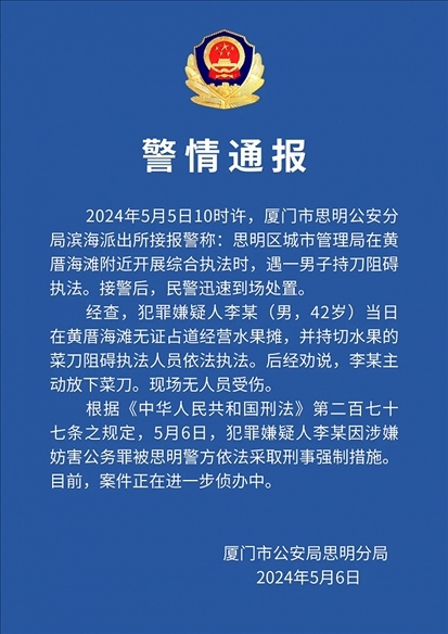 ·廈門警方:無證占道經(jīng)營還持刀阻礙執(zhí)法,一男子被采取刑事強(qiáng)制措施。