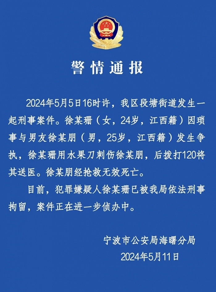 央視網(wǎng)消息:5月11日,寧波市公安局海曙分局發(fā)布警情通報(bào),5月5日16時(shí)許,海曙區(qū)段塘街道發(fā)生一起刑事案件。徐某珊(女,24歲,江西籍)因瑣事與男友徐某朋(男,25歲,江西籍)發(fā)生爭(zhēng)執(zhí),徐某珊用水果刀刺傷徐某朋,后撥打120將其送醫(yī)。徐某朋經(jīng)搶救無效死亡。目前,犯罪嫌疑人徐某珊已被海曙分局依法刑事拘留,案件正在進(jìn)一步偵辦中。
