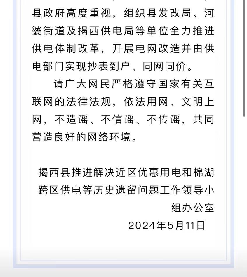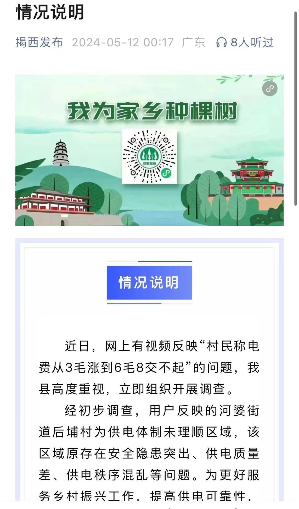 針對(duì)此事,“揭西發(fā)布”微信公眾號(hào)于5月12日發(fā)布了情況說(shuō)明,表示對(duì)網(wǎng)上反映的“村民稱(chēng)電費(fèi)從3毛漲到6毛8交不起”的問(wèn)題高度重視,并已立即開(kāi)展調(diào)查。