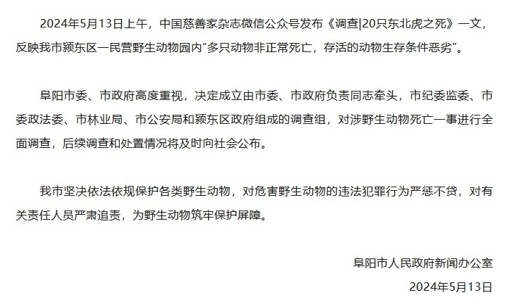 央視網消息:據“阜陽發(fā)布”微信公眾號消息,阜陽市人民政府新聞辦公室發(fā)布情況通報,2024年5月13日上午,中國慈善家雜志微信公眾號發(fā)布《調查|20只東北虎之死》一文,反映阜陽市潁東區(qū)一民營野生動物園內“多只動物非正常死亡,存活的動物生存條件惡劣”。