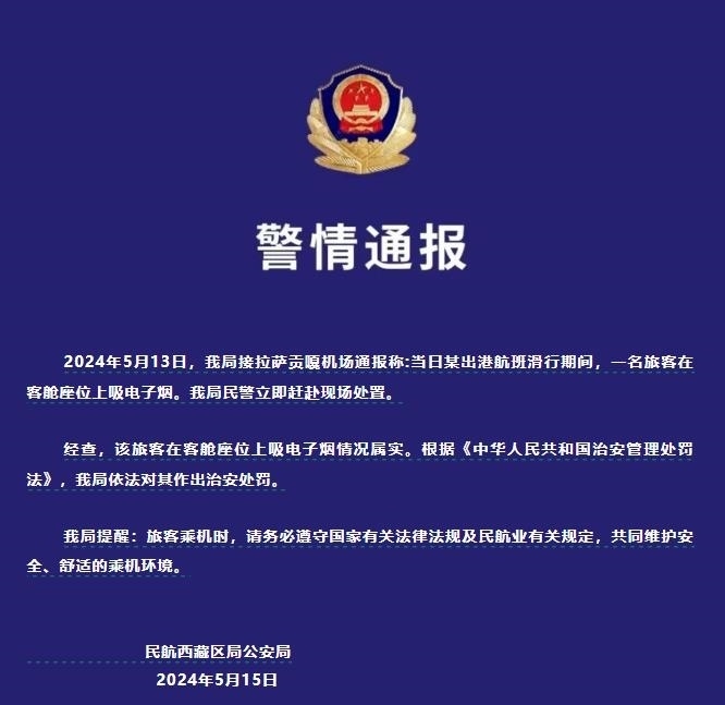 央視網(wǎng)消息:據(jù)民航西藏自治區(qū)管理局公眾號消息,5月15日,民航西藏區(qū)局公安局發(fā)布警情通報稱,5月13日,拉薩貢嘎機(jī)場某出港航班滑行期間,一名旅客在客艙座位上吸電子煙,民航西藏區(qū)局公安局民警立即趕赴現(xiàn)場處置。