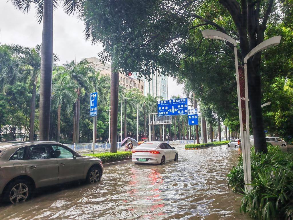 5月19日上午,車輛在廣西南寧市民族大道涉水前行。新華社記者 黃浩銘 攝