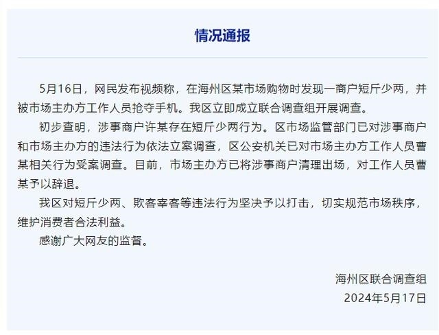 ·連云港通報(bào)海鮮商販“鬼秤”事件:涉事商戶被清理出場(chǎng)。