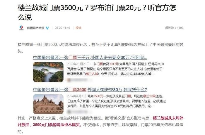 文章稱, ?樓蘭故城一張門票3500元的說法流傳已久,甚至不少不明真相的網(wǎng)民為其冠上了中國最貴景區(qū)的名頭。其實(shí),嚴(yán)格意義上來說,樓蘭故城并不能稱為景區(qū)。據(jù)“若羌文旅”官方賬號消息,樓蘭故城從未對外開放過,3500元門票的說法也不屬實(shí)。不僅如此,羅布泊禁止非法穿越,門票20元有關(guān)信息也是假的。