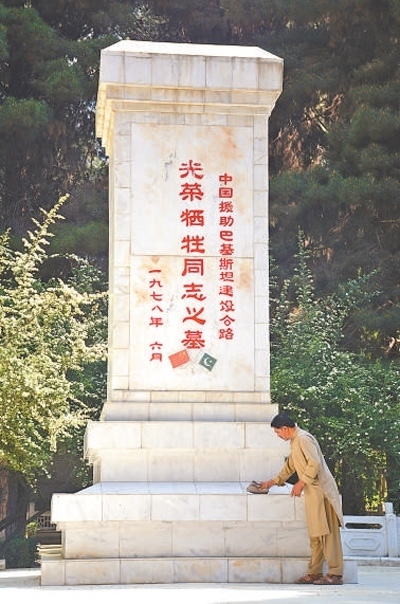 巴基斯坦北部城市吉爾吉特東郊的丹沃爾村有一座中國烈士陵園。1966年至1978年,中國援助巴基斯坦修建喀喇昆侖公路。12年間,數(shù)百名中國工程技術(shù)人員獻(xiàn)出了生命,其中88人安葬在此。從1978年起,艾哈邁德和父親在這里守陵,每天打掃陵園。圖為艾哈邁德在擦拭紀(jì)念碑。本報(bào)巴基斯坦分社 賽義德·邁赫迪攝