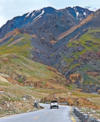喀喇昆侖公路穿越高原山地地區(qū),大量路段區(qū)域海拔高、地質(zhì)條件復(fù)雜,修建難度大。圖為車輛在喀喇昆侖公路高原山地路段行駛。瓦卡斯·阿赫邁德攝