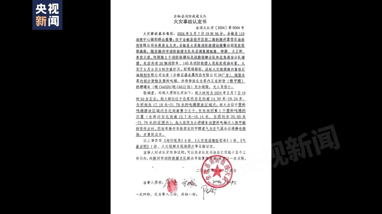 記者從全椒縣消防救援大隊(duì)于5月24日出具的火災(zāi)事故認(rèn)定書上發(fā)現(xiàn),5月7日晚上7點(diǎn)多,滁州富信助劑有限公司倉(cāng)庫(kù)發(fā)生火災(zāi),滁州市消防救援支隊(duì)調(diào)集30輛消防車、140名消防救援人員現(xiàn)場(chǎng)處置,火災(zāi)于5月8日0時(shí)許撲滅。經(jīng)現(xiàn)場(chǎng)勘驗(yàn),該起火災(zāi)燒損滁州富信石油助劑有限公司倉(cāng)庫(kù)、燒毀倉(cāng)庫(kù)內(nèi)部分貨物及塑料噸桶,并將停放在倉(cāng)庫(kù)內(nèi)正在卸粗甲醇的槽罐車完全燒毀,無(wú)人員傷亡。